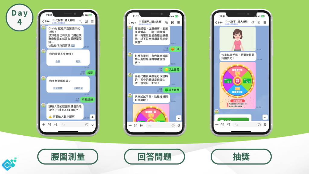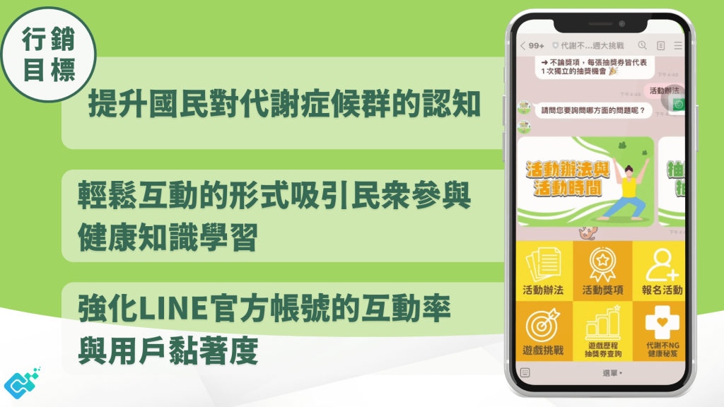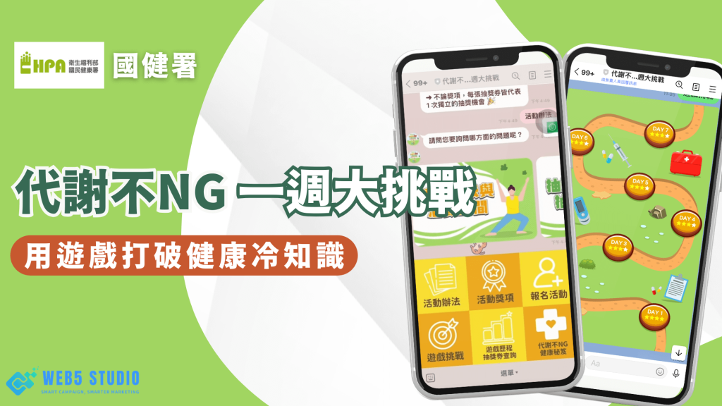 由於面臨民眾對「代謝症候群」認知不足的挑戰,衛生福利部國民健康署首度將公共衛教結合遊戲互動,在LINE官方帳號上推出「代謝不 NG 一週大挑戰」活動。透過每日闖關、知識問答與輪盤抽獎的機制,不僅拉近健康知識與大眾的距離,更創下高達 86% 的參與率佳績。
