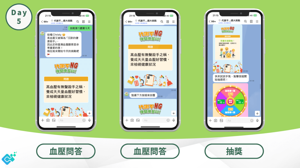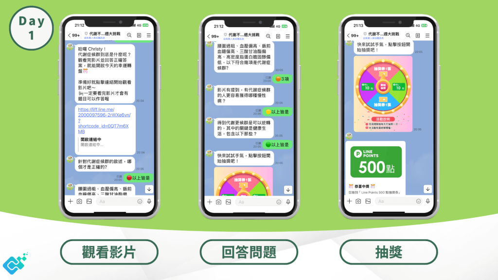 - 每日挑戰設計成功導入「知識→自我檢測→行為改變」的健康行銷流程