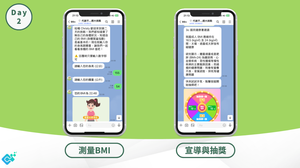 - 即時回饋互動式問答,如用戶輸入 BMI 與腰圍即時計算等,快速產生個人化健康回饋