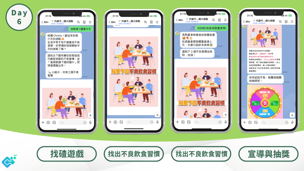 「代謝不 NG 一週大挑戰」將衛教內容遊戲化,設計出為期七天的互動關卡,流程如下:
